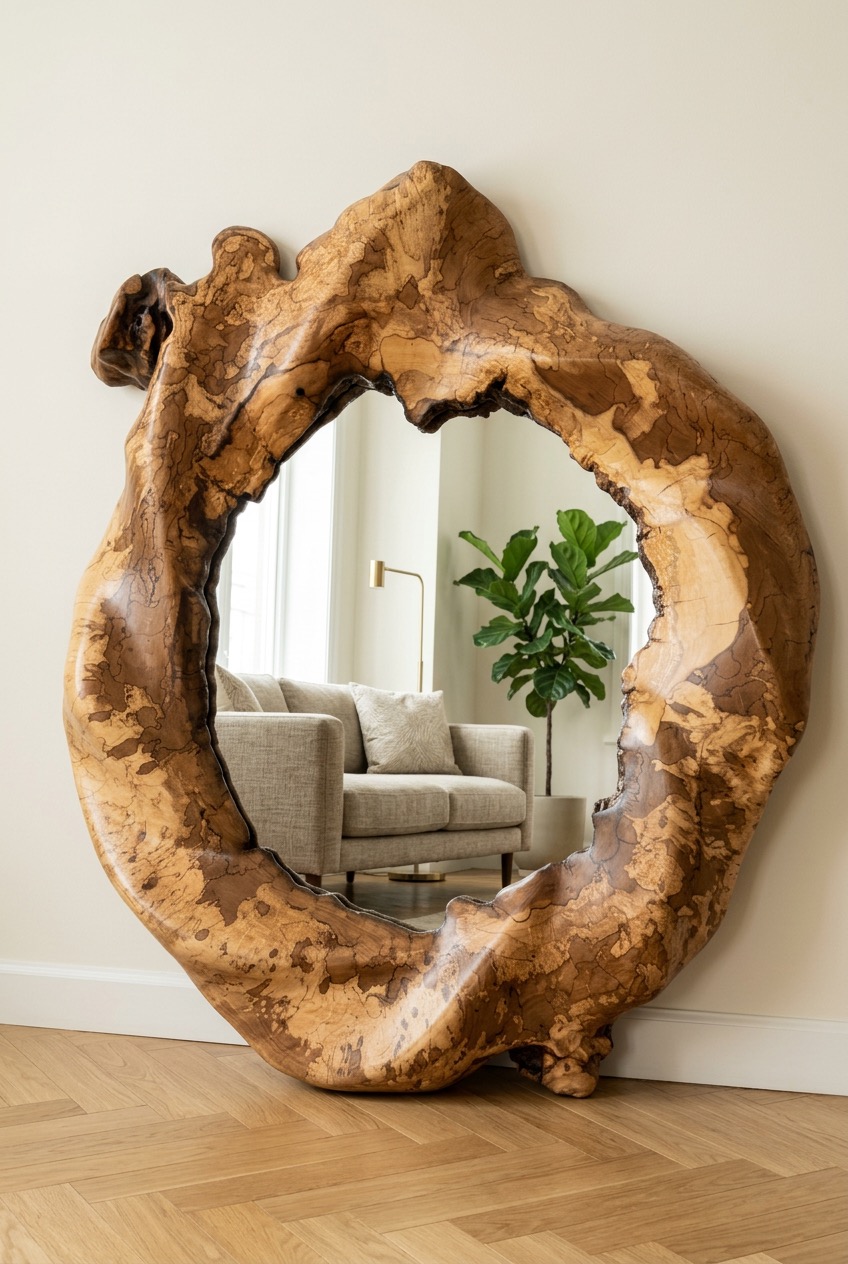 Массивная рама из натурального спила Бука с живой текстурой — сучки , трещины, природная форма. Не фабричное МДФ, а настоящее дерево для твоего лофта, сканди или эко-интерьера. Размер идеален для гостиной или прихожей, отражает свет и пространство. Диаметр с рамой 1000 мм Размер зеркала 600+ мм