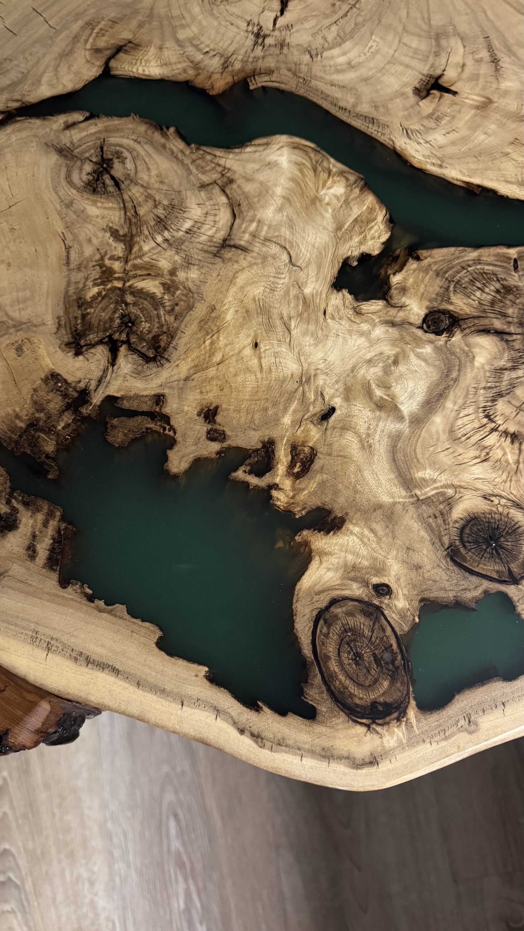 Живая древесина с сохранённой корой по кромке, подчёркнутая заливкой глубокого травянисто‑зелёного оттенка, напоминающей уральские горные травы. Неровный контур слэба и натуральные перепады цвета делают каждый стол уникальным, а лаконичные металлические опоры добавляют совремённости и позволяют вписать его и в загородный дом, и в городскую квартиру.